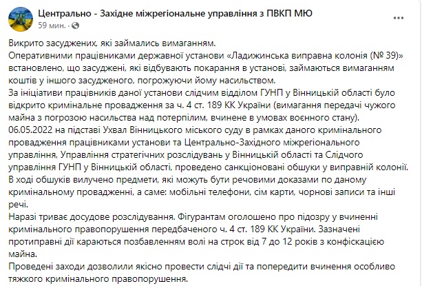 6 травня 2022 року на підставі ухвал Вінницького міського суду силовики здійснили "шмон" у колонії, під час якого було виявлено чорнові записи, мобільні телефони та інші речі, які можуть вказувати на причетність зловмисників до скоєння злочину. Дії чоловіків наразі кваліфіковано в контексті вимагання (ч.4 ст.189 КК України).