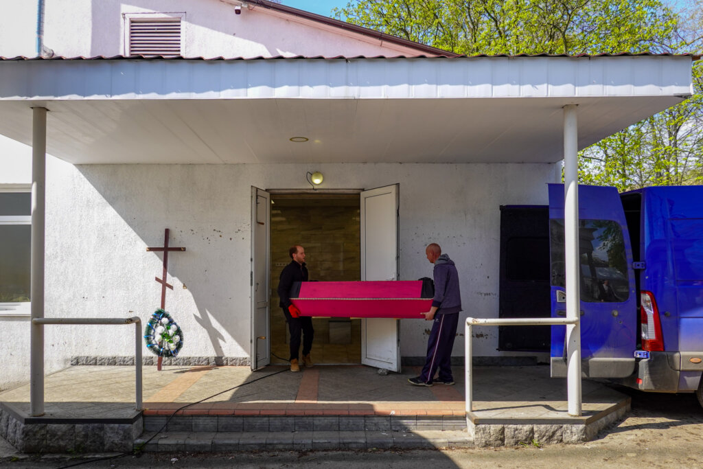 Выносят гроб 85-летней Ольги Шевченко. Ее приехал забрать внук Алексей. Когда 10 апреля он вернулся в Бучу, нашел останки своей бабушки в сгоревшем сарае возле разрушенного дома. Вызвал полицию, составили протокол, а после этого коммунальная служба забрала останки в морг. Задержек никаких не было.
