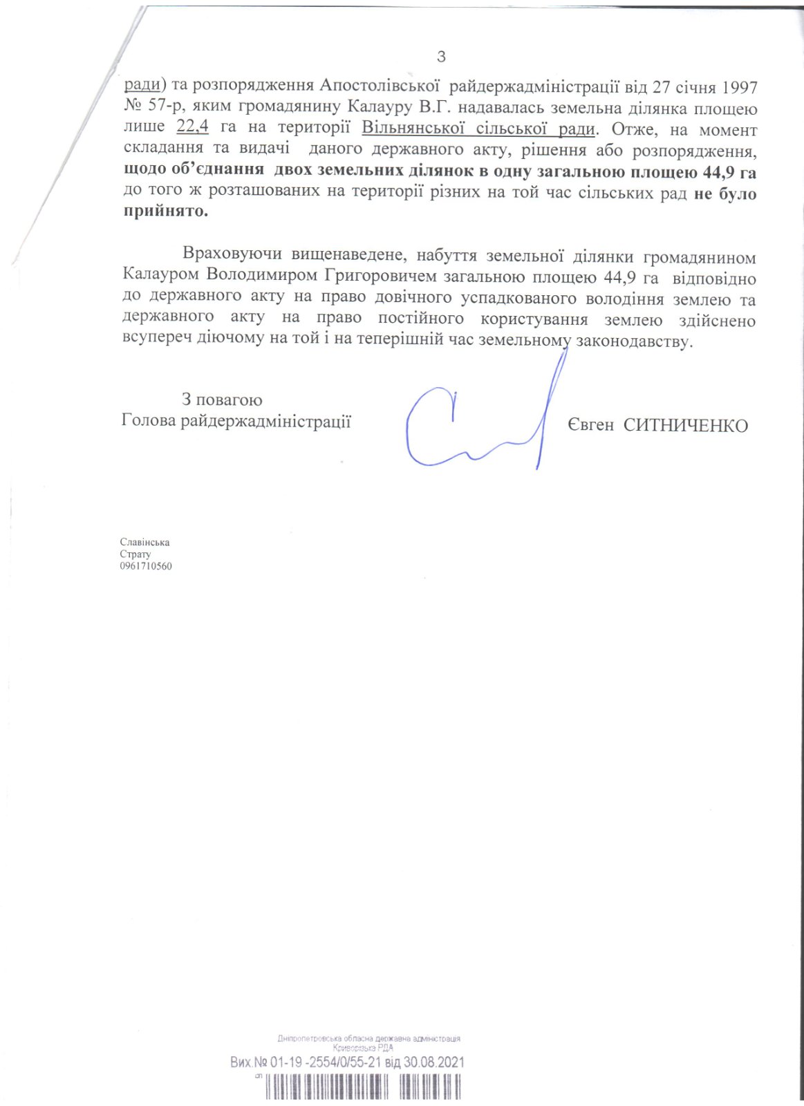 Поэтому военная администрация совершенно справедливо и на законных основаниях распорядилась коммунальной собственностью так, как сочла наилучшим образом. Однако, Калаур и Гергель отреагировали на это совершенно неадекватно, в стиле 90-х. Поскольку у них не было законных оснваний пользоваться землей громады, то и сохранить ее за собой они пытаются незаконным путем. Почему, например, было не обратиться к "вышестоящей" военной администрации Криворожского района с просьбой разобраться в ситуации? Вместо этого начался поток угроз и клеветы в адрес Нивотрудовской сельрады. Началось запугивание какими-то связями в высоких киевских кабинетах, что на самом деле дискредитирует в глазах людей украинскую власть и парламент во время войны.