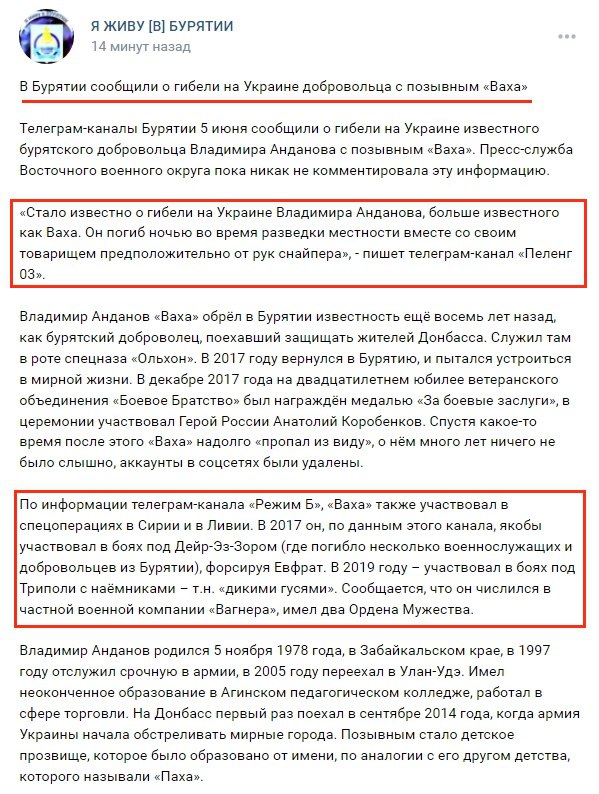 Под Харьковом убит наемник ЧВК «Вагнер», «ветеран Донбасса» бурят «Ваха»