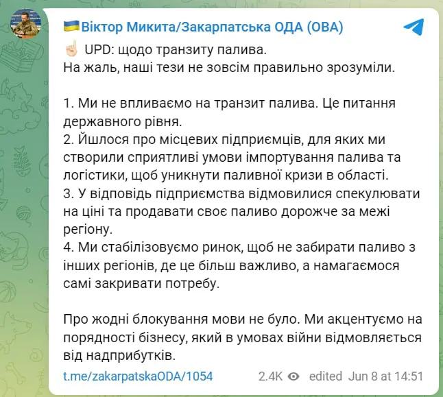 Микита заявил, что транзит топлива является вопросом государственного уровня. Он также добавил, что речь шла о том, что местные предприятия не спекулируют на цене и не продают топливо в другие области. По его словам, Закарпатье не хочет «забирать топливо у других регионов», поэтому пытается само закрыть свои потребности.