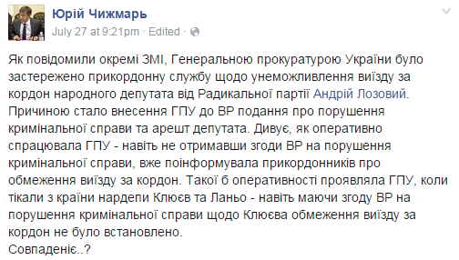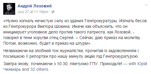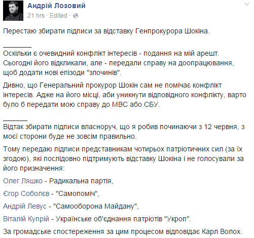 Отметим, что в преддверии новых обвинений, пыл Андрея Лозовой немного поутих. И сообщил, что прекращает сбор подписей в Верховной Раде против Шокина из-за «конфликта интересов».
