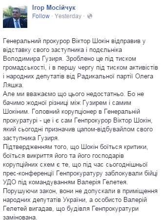 Вместо того, чтобы испугаться, недруги Шокина - Порошенко снова пошли в наступление. Они инициировали акции под ГПУ и, во главе с Ляшко, снова прорвались на прием к Генпрокурору. Вместо себя и коллег, главный радикал в очередной раз предложил Шокину сконцентрироваться на привлечении к уголовной ответственности нардепов из Оппоблока: Евгения Бакулина и Юрия Бойко. Намекнул, что его полит сила собрала уже 150 подписей депутатов за отставку Генпрокурора. В соцсетях кинули соответствующий клич.
