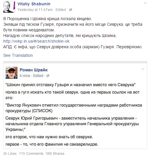 Новость о личном визите Шокина в Печерский суд понесли активисты, во главе с еще одной головной болью президента – руководителем ГО «Центр противодействия коррупции» Виталием Шабуниным. А где он, там Соболев, и другие товарищи. В общем, президентской администрации пришлось срочно брать инициативу в свои руки и начинать действовать. Предварительно, 16 июля глава ГПУ увольняет прокуроров-взяточников, но активисты теперь требуют убрать с должности и его зама Гузыря, которого уже вместо самого Шокина обвиняют в давлении на следствие. 28 июля Гузырь подает в отставку.