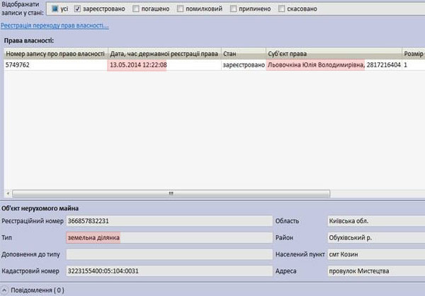 Отметим, участок может принадлежать народному депутату («Оппозиционный блок») Юлии Левочкиной. Так, согласно данным в Государственном реестре вещественных прав, обнародованным в СМИ в 2014 году, участок был зарегистрирован на нее 13 мая 2014 года.