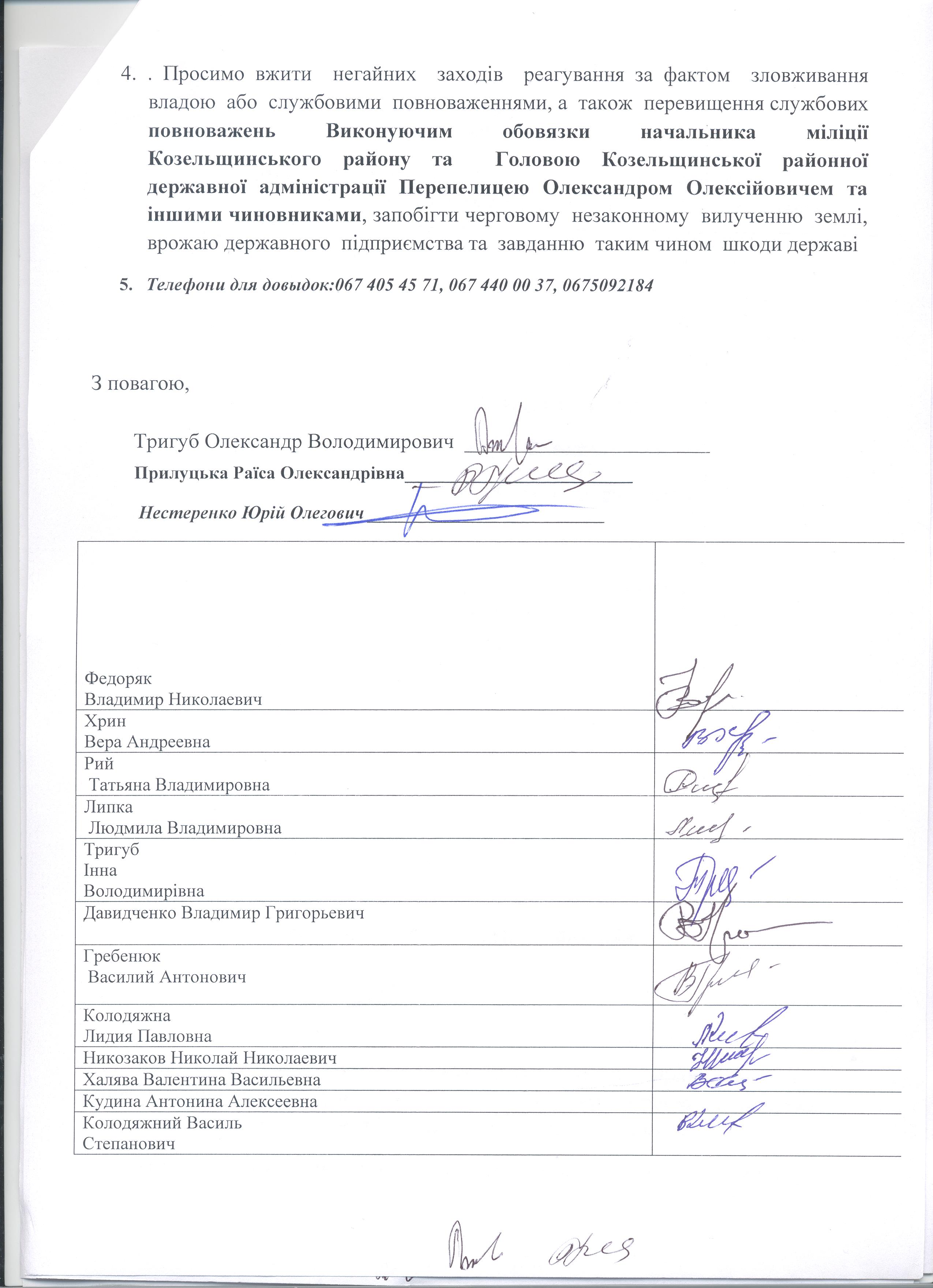 Громада та працівники фабрики запевняють, що зкмлю "віджимають" за прямою вказівкою та особистою зацікавленістю Голови Козельщинської РДА Перепелиці О.О., якому допомагають силові структури Козельщинська міліція та районна прокуратура.