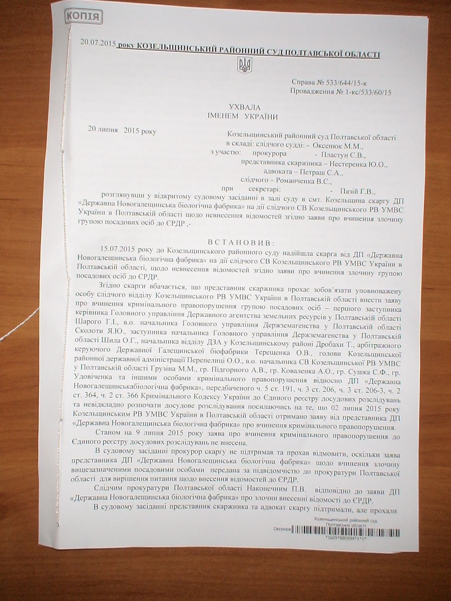 На пошту ГО "Останній Бастіон" надійшов лист із документами, рішеннями й судовими справами та зверненням до Президента Петра Порошенка, у яких викриваються незаконні дії першого заступника керівника головного управління Державного агенства земельних ресурсів у Полтавській області Шарого Г.І., в.о. начальника Головного управління Держземагенства у Полтавській області Сколота Я.Ю., арбітражного керівника Терещенка О.В., голови Козельщинської РДА Перепелиці О.О., які вчинили ряд протиправних дій, спрямованих на переведення з державного в приватне користування земельної ділянки, площею 300 га, 5 із яких перебувають у межах Солоницької сільради Козельщинського району та належить Державній Галещинській біофабриці.