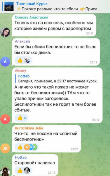Однако перед сообщением губернатора в местном Telegram-канале появилась информация о том, что над Курском низко пролетел самолет, после чего прозвучал взрыв. Некоторые жители города также не поверили в версию про сбитый беспилотник и сообщали, что возможно, был "прилет". Однако их комментарии об этом в курских пабликах удаляли.