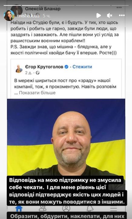 "Наезды на Студию были, есть и будут. У тех, кто что-то делает и делает это хорошо, всегда были завидующие и мешающие люди. Но пошли они все вслед за российским военным кораблем! Всегда знал, что мишина – (нецензурное слово), но в качестве политической хвойды вижу ее впервые. Растет", - написал редактор.