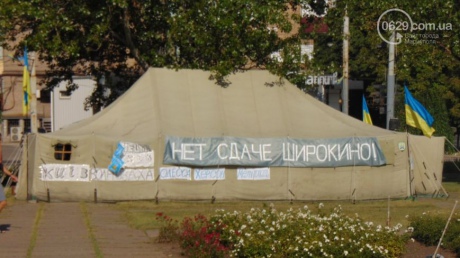 На акції присутні близько 150 осіб. Учасники акції виступають проти ініціативи контактних груп створити 30-км зону в р-ні Широкиного  та відвести важке озброєння від центру населеного пункту на 15 км. На думку активістів, це відкриє бойовикам дорогу до Маріуполя.