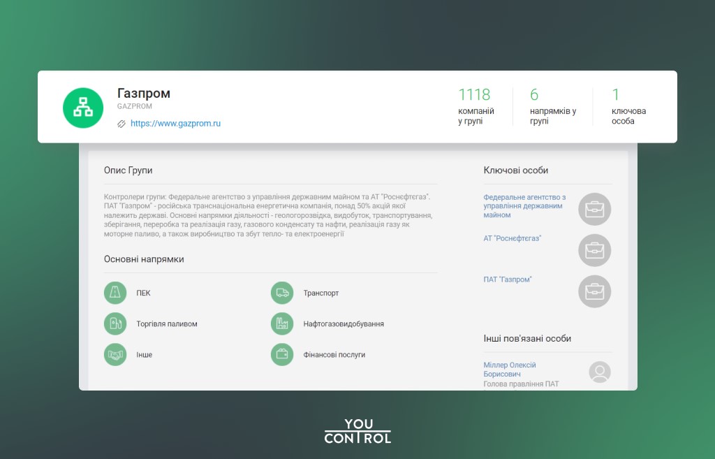 Зв’язки російських ФПГ з Україною. 6 російських ФПГ із 17 доданих до системи Youcontrol, а саме Газпром, Роснєфть, USM, група родини Лебедєвих, групи Олега Дерипаски та Олексія Мордашова, мають з’язки з українськими компаніями.
