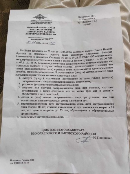Любов Коваленко вирішила добиватися справедливості у поліції, але її там запевнили, що складу злочину в цій ситуації не бачать, тому в порушенні кримінальної справи відмовили. Тоді сестра окупанта написала заяву у військкомат, намагаючись виплатити компенсацію за загиблого брата. Судячи з дати її звернення, 15 червня вона сподівалася, що виплату просто продублюють, але у військкоматі дівчині відповіли, що "гробові" їй не належать.