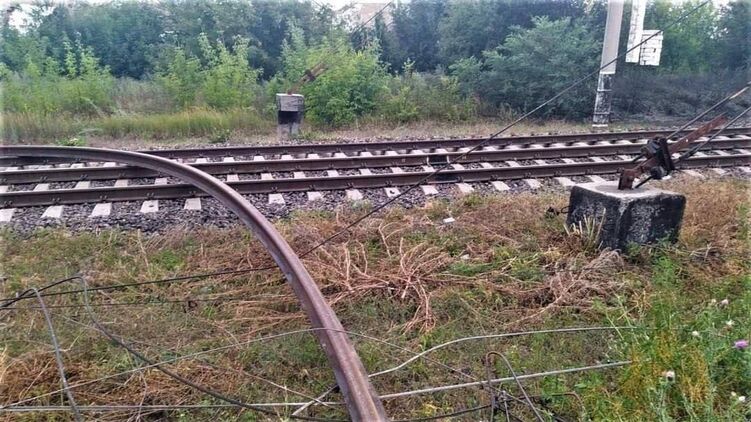 На опубликованных фото видно, что в результате ракетной атаки часть колей погнуло, а местами оторвало. Также повреждены железобетонные столбы и провода.