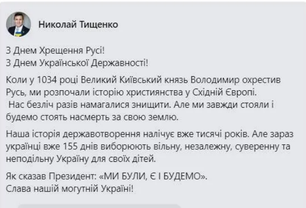 Згодом допис на сторінці Тищенка зник, а на його місці з’явився новий, де нардеп уже привітав українців із Днем Державності.