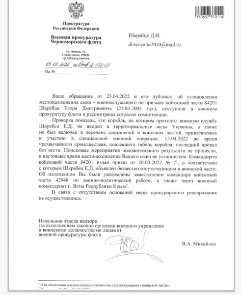 "Шкребець Єгор Дмитрович, матрос строкової служби на призов, старший вестової служби постачання, офіційно визнаний Генеральним штабом учасником бойових дій у складі екіпажу крейсера "Москва", — загинув. Тепер і документально", — зазначив Шкребець.