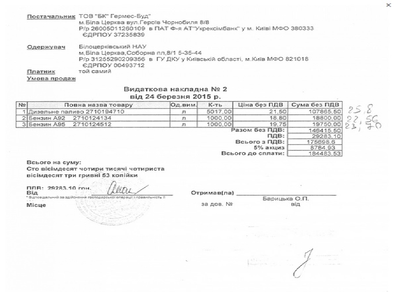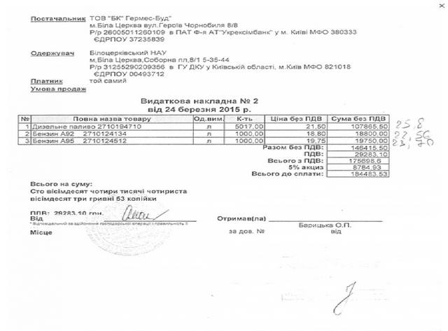 "24" березня 2015 року Білоцерківський національний аграрний університет закупив у Будівельної компанії "Гермес-Буд" паливо за такими цінами: