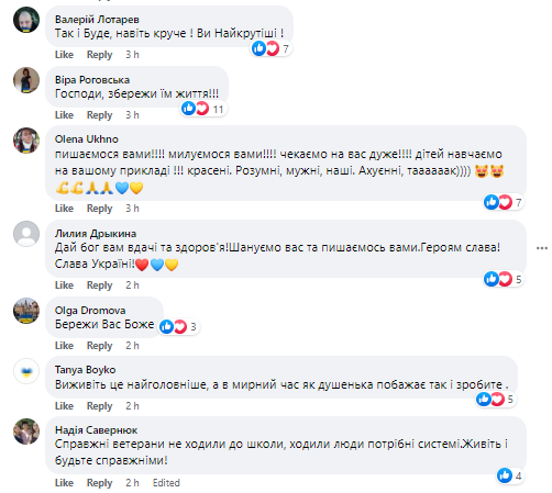 "Ви неймовірні воїни і будете неймовірними ветеранами", "Так і буде, навіть крутіше! Ви найкрутіші", "Головне - щоб ви всі були і щоб вас усіх було багато! Живих, веселих, розумних, загартованих", - йдеться у коментарях .