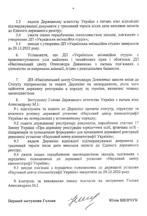 Згідно з наказом Держкіно всі фільми з колекції та майно Довженко-Центру мають бути передані Державній установі “Науковий центр кінематографії України”, основним видом діяльності котрої за даними ЄДРПОУ є “вища освіта”. Зі структури Центру має бути виокремлено Державне підприємство “Українська анімаційна студія”, до якої будуть передані авторські права на українську анімацію, що зараз належать Центру. Співробітників Центру має бути повідомлено про можливе звільнення.