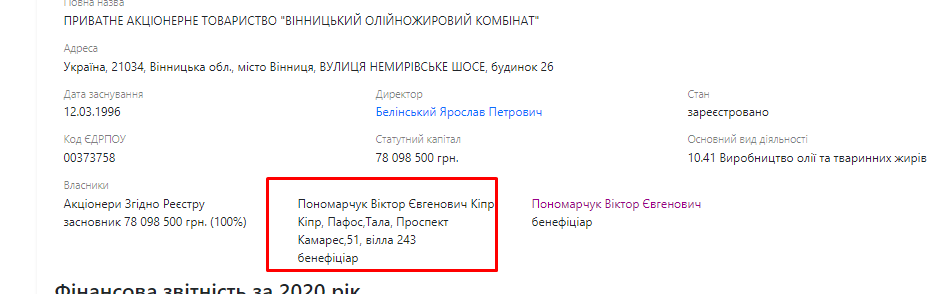 Зазначимо, управління виробничою групою компаній Vioil, до якої входять великі виробники рослинної олії ПрАТ «Вінницький олійно-жировий комбінат» та ПрАТ «Чернівецький олійно-жировий комбінат», здійснюється через ТОВ «Вінницька промислова група». Вона оформлена на кіпрський офшор Varhomio Holding Limited, 99% статутного капіталу якого належить росіянину Віктору Пономарчуку.