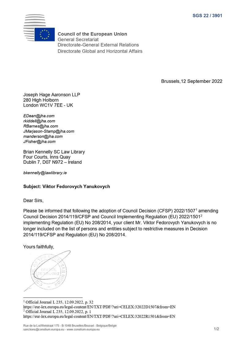 За його словами, про це Генеральний секретаріат ЄС повідомив Януковича своїм листом від 12 вересня 2022 року.