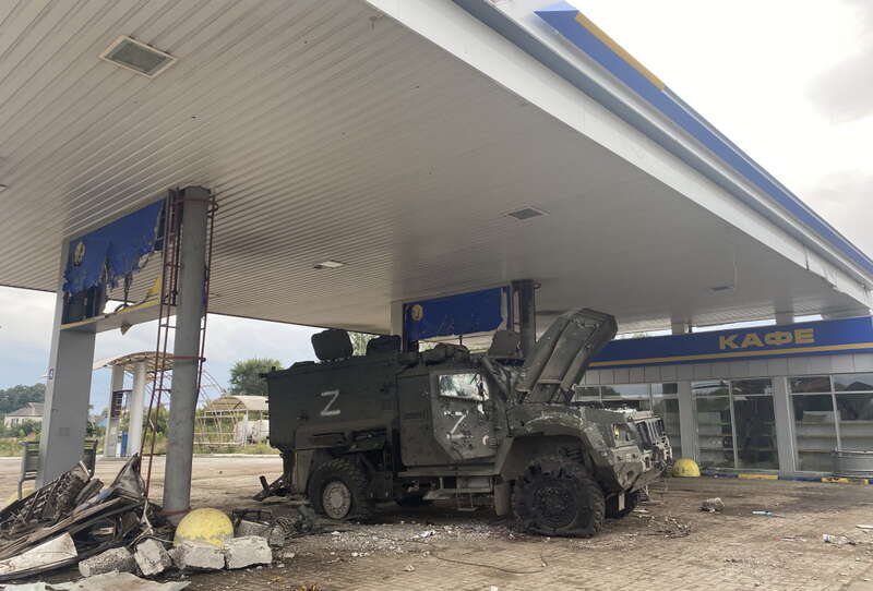 Від Харкова до звільненого Ізюма дві години їзди розбитими дорогами повз поля з незібраною пшеницею. Обабіч траси – спалена російська бронетехніка і трупи російських солдатів, які ще також не встигли прибрати.
