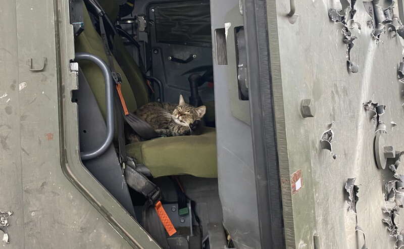 На вигорілій автозаправці стоїть розбита бронемашина із Z-маркуванням. У кабіні мирно спить кицька.