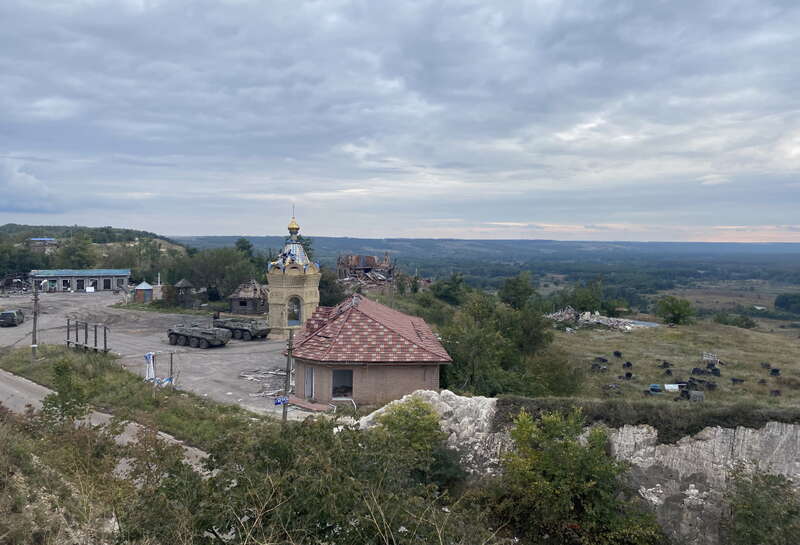 Звідси відкривається неймовірний краєвид на ізюмські дахи, а водночас і велика трагедія. На цьому місці люди платили життям за телефонний дзвінок з окупації. На пагорбі знайшли кілька десятків трупів.