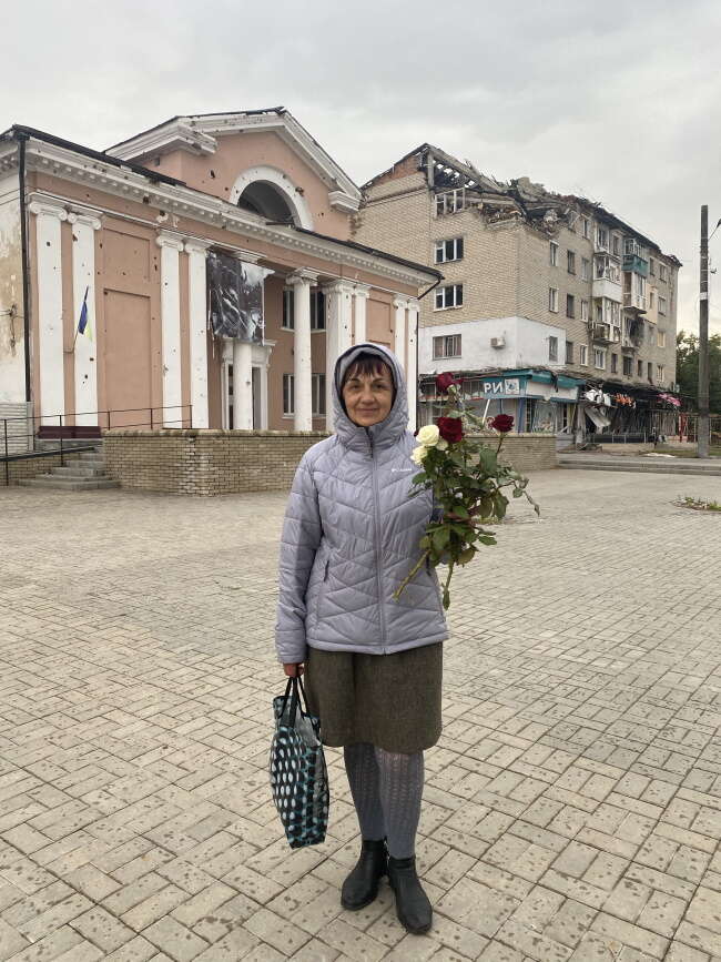 “Оце ж підпалили нам росіяни мерію, коли тікали. В центрі міста ми вдруге за пів року, свято ніби, то і квіти, бо жили в ізоляції”, – розповідає пані Ольга.