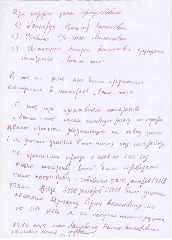 Все свои отношения он имел и даже некоторые оформлял с земельным кооперативом «Лотос-2007». Участок не получил, о чем своим заявлением извещает председателя другого садового кооператива - «Орхидея-3».