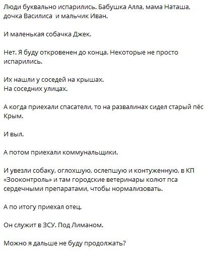 "Пес на ім’я Крим сидить на руїнах, де нещодавно був розташований його будинок. 29 вересня окупанти вдарили по приватному сектору Дніпра. В результаті загинула ціла родина: бабуся, мати та двоє дітей", – йдеться у пості.