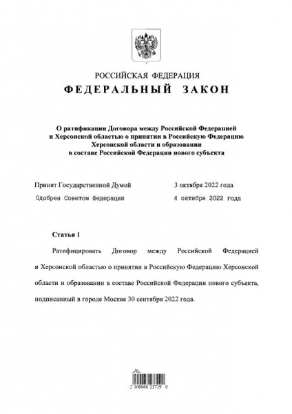 Сьогодні, 5 жовтня, президент Росії Володимир Путін підписав закони про так зване "входження" чотирьох регіонів України до складу Росії.