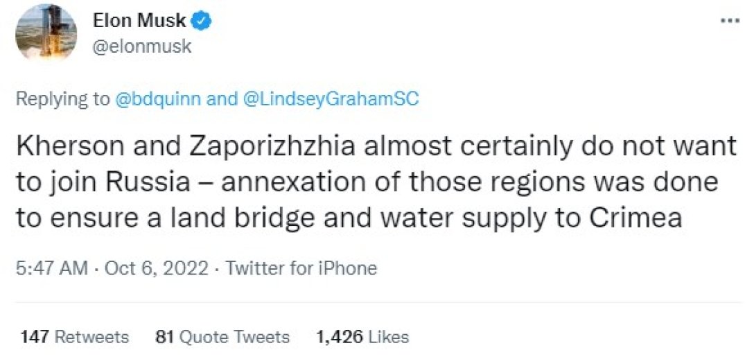 Останні кілька днів американський мільярдер Ілон Маск розмірковує на геополітичні теми щодо України. У Twitter була помічена словесна "перепалка" Маска з сенатором США Ліндсі Гремом та іншими передплатниками, де бізнесмен заявив, що анексію Херсонської та Запорізької областей було здійснено Росією для забезпечення сухопутного коридору та водопостачання Криму.