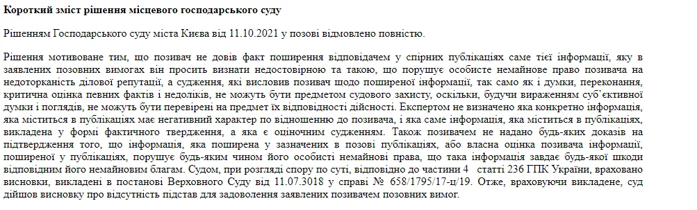 "Право на звернення до суду не повинно використовуватися як спосіб тиску на свободу слова та журналістську діяльність", - йдеться у рішенні суду.