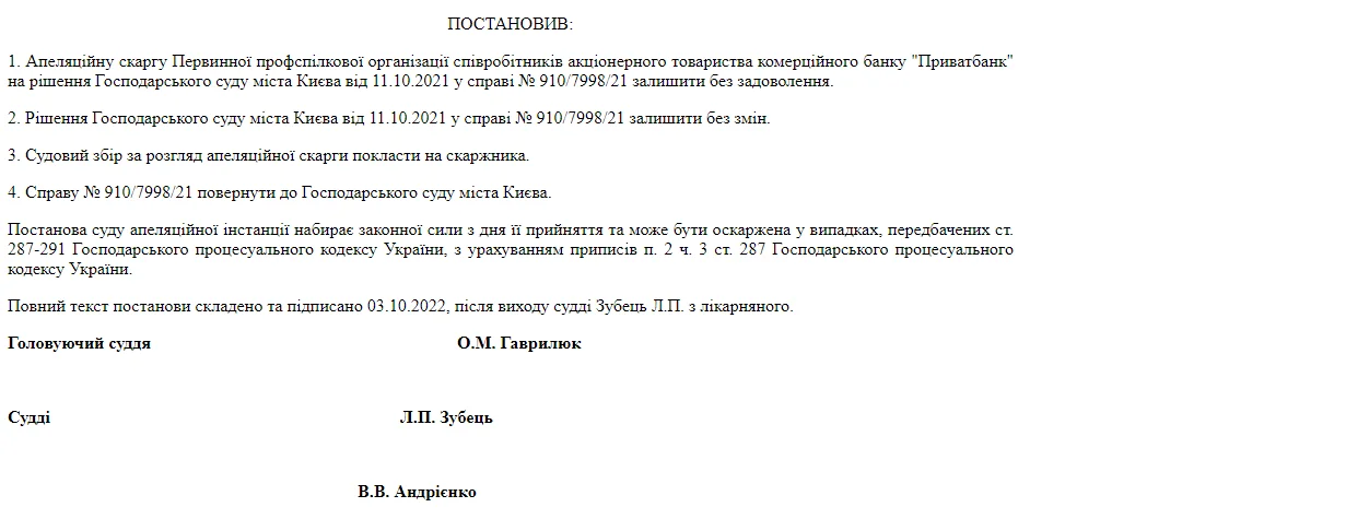 « Апеляційна скарга Первинної профспілкової організації співробітників акціонерного товариства комерційного банку Приватбанк на рішення Господарського суду у Києві від 11.10.2021 у справі № 910/7998/21 задоволенню не підлягає. Рішення Господарського суду у Києві від 11.10.2021 у справі № 910/7998/21 слід залишити без змін », - йдеться у рішенні суду.
