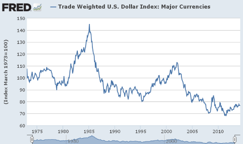 График индекса доллара по отношению к основным мировым валютам (1970-2013), данные Федерального резервного банка Сент-Луиса