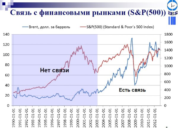 Российский Институт энергостратегии отмечает, что примерно с 2003 г. колебания цен на нефть уже имеют связь с движениями основных биржевых индексов.
