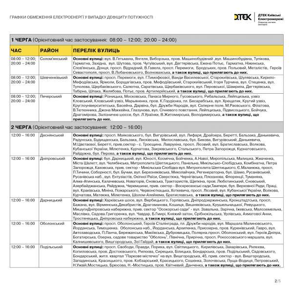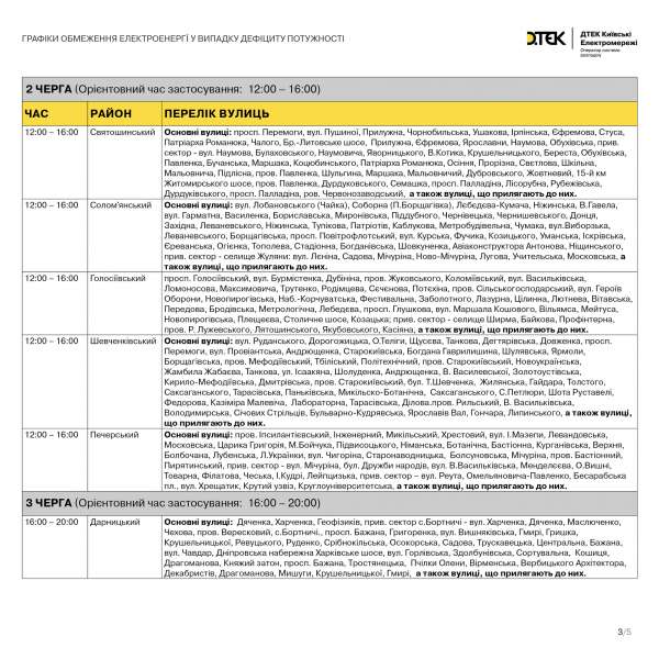 Прес-служба ДТЕК Київські електромережі ("Київенерго") повідомила, що тимчасово обмежується електропостачання до частини 3-ої черги та опублікували наступний графік:
