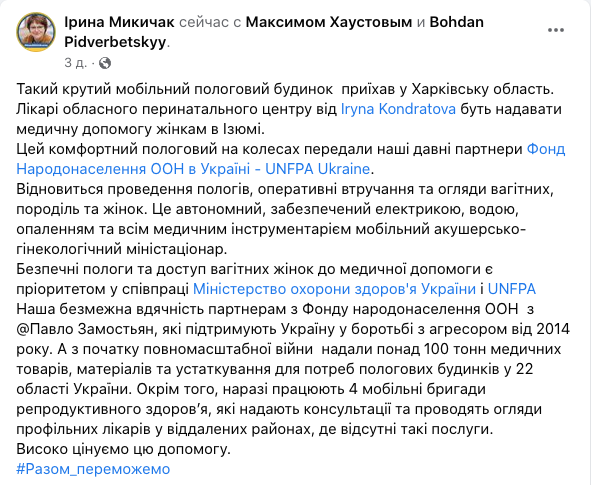 В Ізюмі Харківської області розпочав роботу мобільний пологовий будинок на колесах. Це автономний, забезпечений електрикою, водою, опаленням та всім медичним інструментарієм мобільний акушерсько-гінекологічний міні-стаціонар.