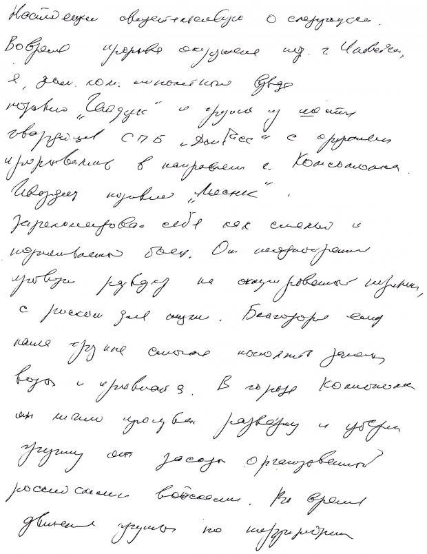 Я залишив автомат, пішов на розвідку. Треба ж якось в місто зайти, знайти нашу Національну гвардію. Іду і бачу, що якось на мене все дивно косяться. Проходжу повз кинутий блокпост, там хлопчаки місцеві граються. Вони мене питають: "Дядьку, а Ви з "ДНР"?". Я відповів, що ні. "А Ви хто, українська армія?". Я щось невиразне у відповідь промимрив, а мені один з хлопчиків каже: "Дядьку, тікайте звідси! Вас уб’ють. Тут всюди "ДНР". На сусідній вулиці вже БТР стояв, на якому "ДНР" написано було.