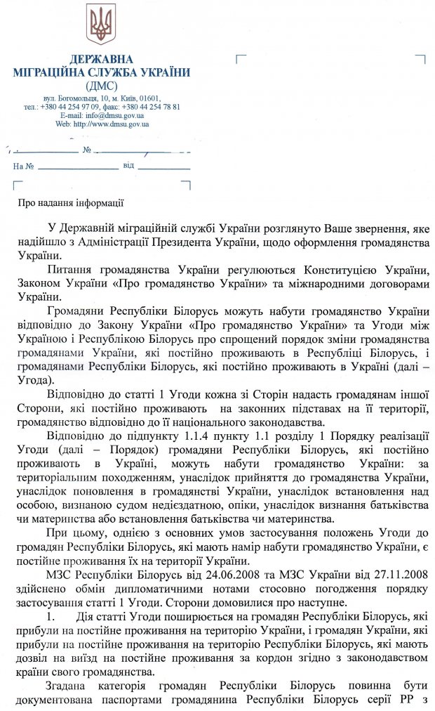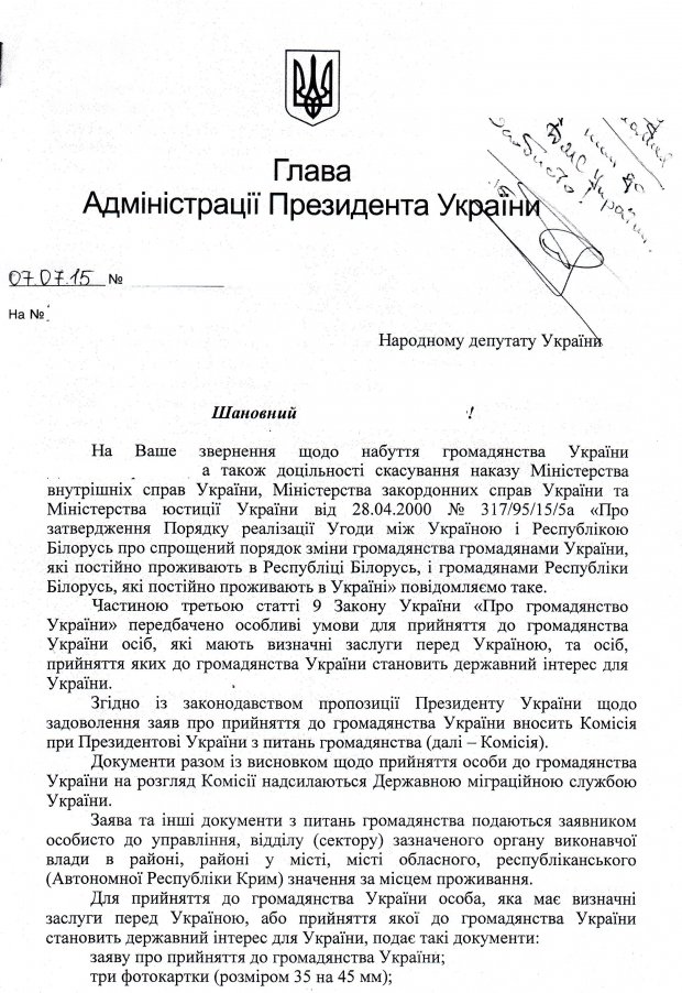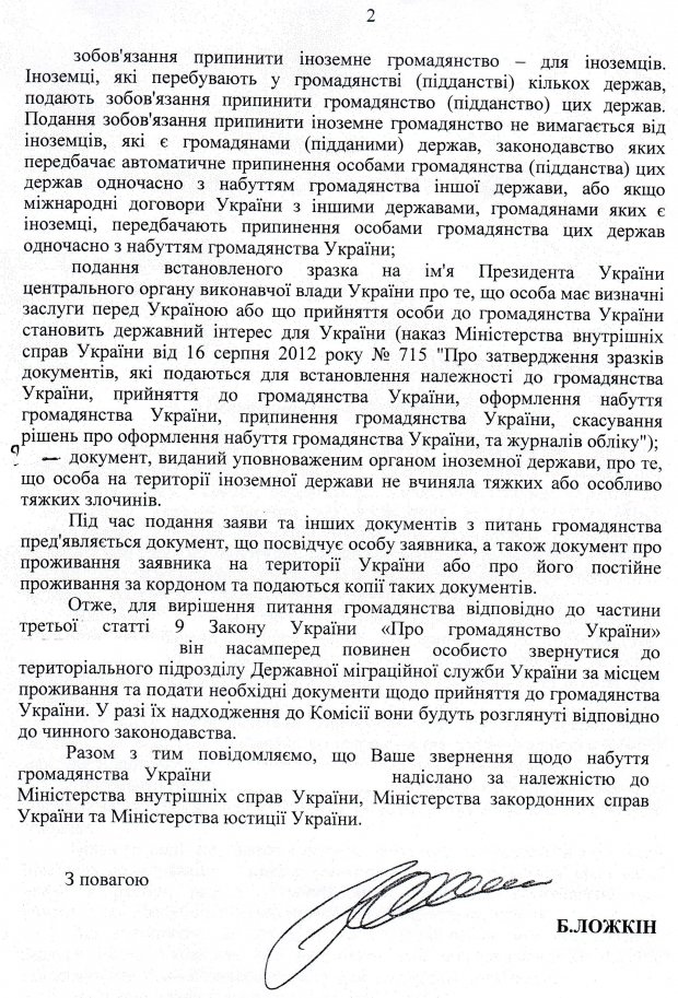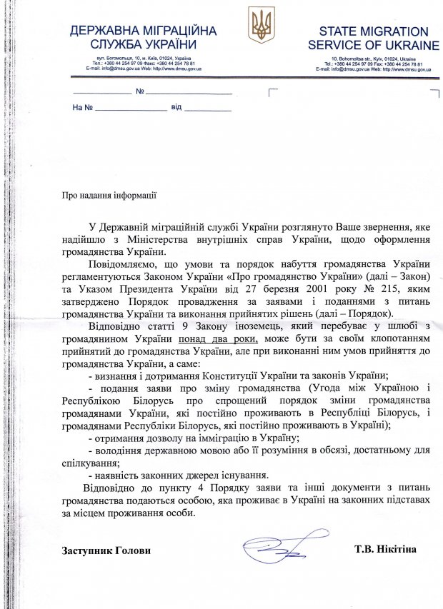 Потім я звернувся за допомогою до народного депутата, який написав запит голові Адміністрації Президента. Відповідь прийшла, з підписом пана Ложкіна. Він також надіслав мені виписку з законодавства про те, що я повинен зробити для отримання громадянства.