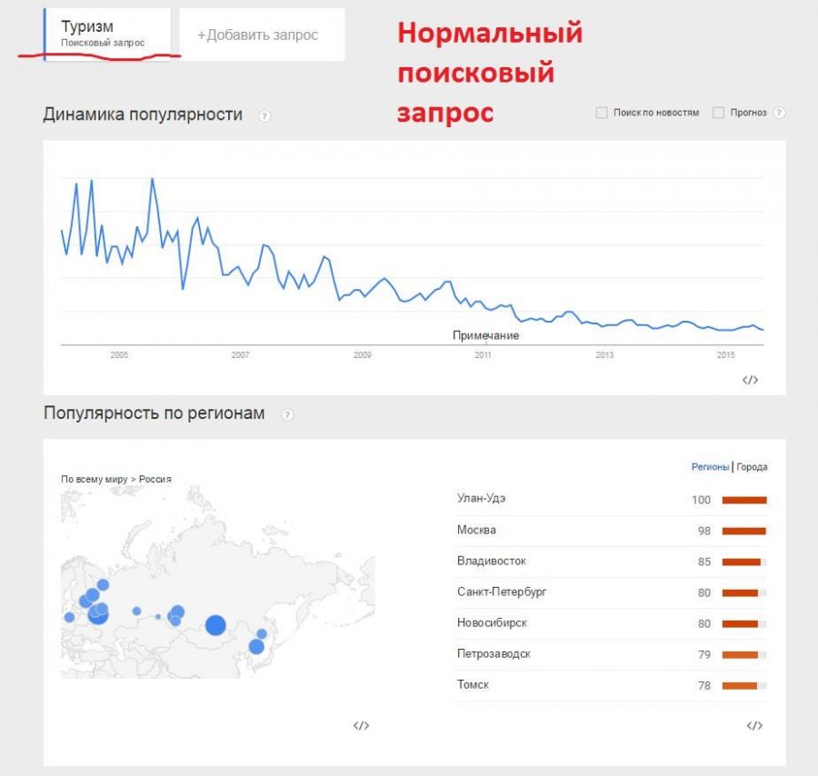 Например, легко узнать, что «Туризмом» очень часто интересуются в столице Бурятии Улан-Удэ и в Москве, «Съедобными грибами» — в Волгограде, а творчеством «Михаила Круга» — на родине, в Твери.