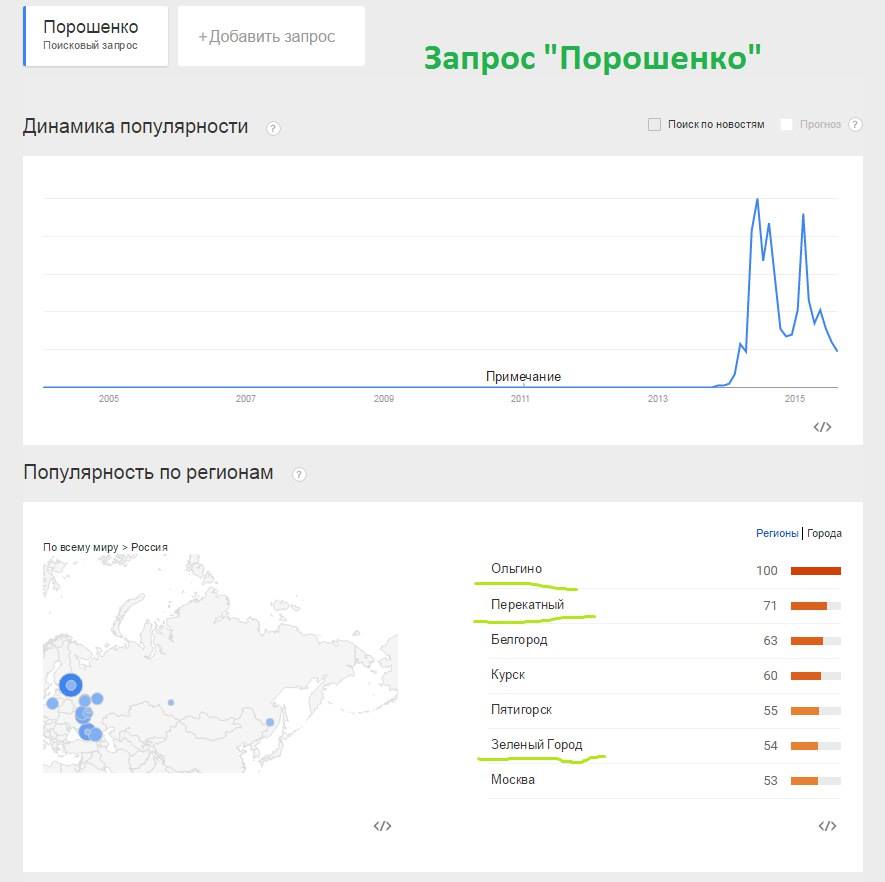 Совершенно внезапно на первые места в таких запросах выходят НЕ города-миллионники и даже НЕ приграничные к Украине области.Почти в любых политических запросах фигурируют маленькие поселки Ольгино, Яблоновский, Перекатный и Зеленый Город. По интенсивности запросов они иногда обгоняют даже Москву и Санкт-Петербург!