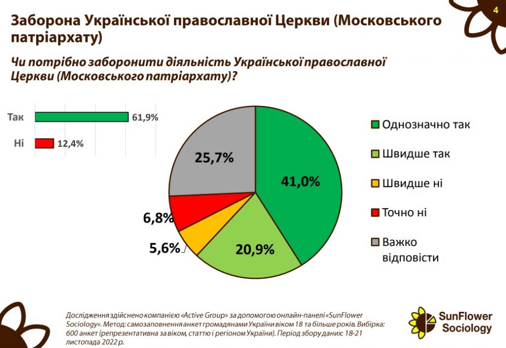 Щодо заборони діяльності Української православної Церкви (московського патріархату), то 61,9% респондентів сказали, що така заборона потрібна (41% відповіли, що однозначно потрібно заборонити діяльність цієї церкви, 20,9% – швидше потрібно). Проте 5,6% респондентів вважають, що швидше не потрібно забороняти діяльність УПЦ МП, а 6,8% – що точно не потрібно забороняти. Кожен четвертий (25,7%) не визначився із відповіддю на запитання.