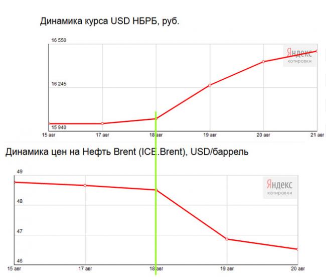 Но требования Лукашенко оказались пустым пустозвонством. 19 августа белорусская валюта продолжила обвал, девальвировав за три дня почти на 480 рублей. И опять совпадение: в этот же день, 19 августа началось очередное падение мировых цен на нефть (см. диаграмму).