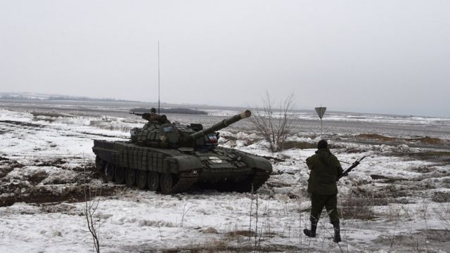 Танк одного із загонів сепаратистів (судячи з прапора ЛНР, намальованого на вежі) під Єнакієвим у 2015 році. По замерзлому ґрунту важкій бронетехніці пересуватися набагато простіше. ФОТО, AFP