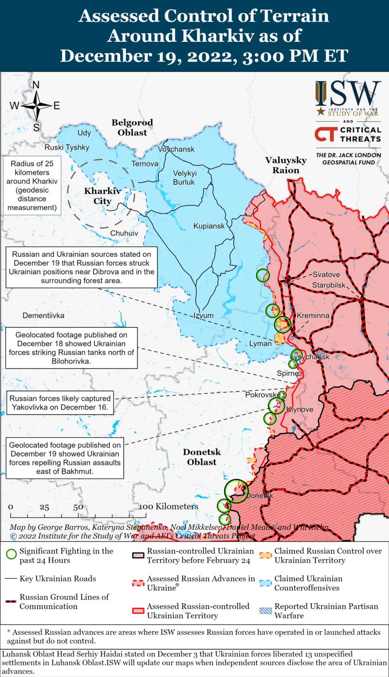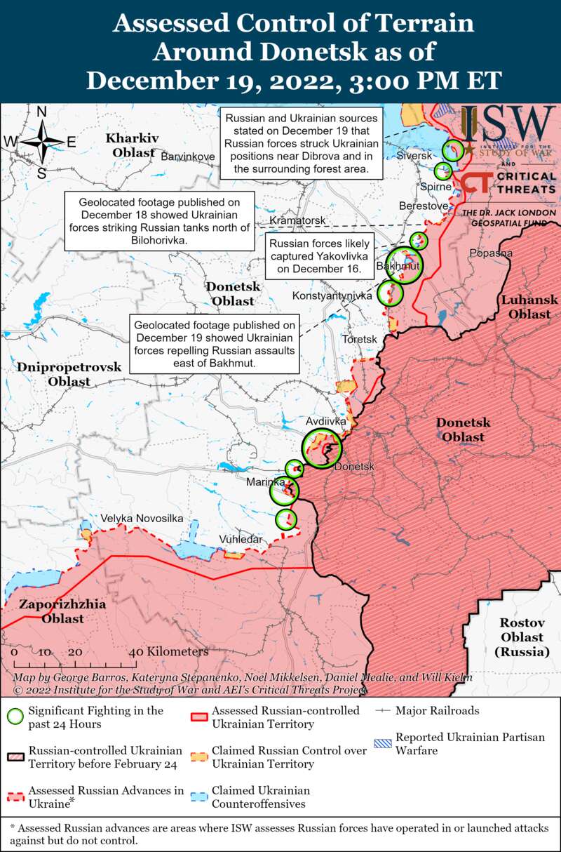 Повідомляється також, що 18 грудня російські сили втратили позиції на південь від Бахмуту та продовжили наземні атаки в районі Бахмута та Донецька. Як пише Інститут, російський військовий кореспондент, який, як повідомляється, відряджений до підрозділу, що бився на південь від Бахмута, 18 грудня визнав, що українським військам вдалося вибити російські війська з позиції, за які вони боролися "усю осінь".