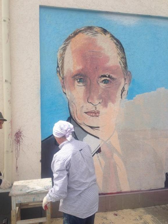 В центрі Сімферополя вже замалювали портрет Путіна, який два тижні тому з’явився на стіні будівлі до дня приїзду президента Росії