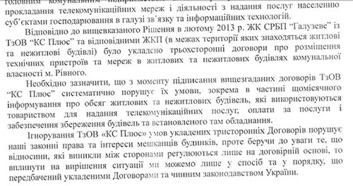 А последним из доказательств того, что «методы экономии» не поменялись, может служить коллективное письмо провайдеров г. Ровно. В этом коллективном обращении указывается, что ООО «КС Плюс» (под этим названием «Триолан» работает в городе), систематически нарушает условия трехсторонних договоров о размещении технического оборудования и сетей в жилых и нежилых зданиях коммунальной собственности, не оплачивая услуги, нанося вред помещениям, уже не говоря об обязательном ежемесячном информировании о количестве абонентов и пр. Кроме того, по информации жилищно-коммунального предприятия «Галузеве», ответственного за координацию работ по прокладыванию телеком-сетей и деятельности по предоставлению услуг населению в части связи и информационных технологий, а также местных активистов, большая часть телеком-оборудования и вовсе была установлена оператором без получения разрешительных документов на строительство.