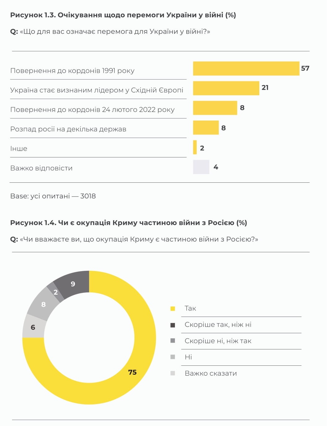 Перемогою у війні над російським агресором більшість українців вважатиме повернення до кордонів 1991 року, тобто разом з окупованими територіями Донецької і Луганської областей та Кримом. Також для вагомої кількості громадян перемогою у війні стане визнане лідерство України в Східній Європі.