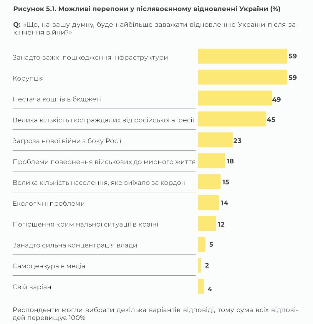 Після перемоги Україна має долати наслідки війни, але, окрім безпосередньо руйнувань, пошкоджень і втрат, країні заважатиме відновлюватись і корупція. Українці усвідомлюють цю проблему і сприймають її як серйозний виклик.